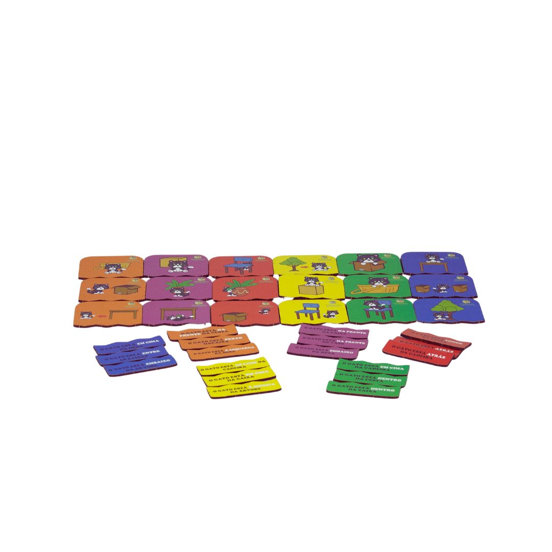 Este recurso, composto por 18 quebra-cabeças em MDF, estimula a associação entre a escrita e a representação visual, ou seja, as crianças conectam as frases que descrevem a posição do gatinho com o seu desenho. Consequentemente, o jogo é uma forma excelente de desenvolver a leitura e a compreensão de conceitos de posição.