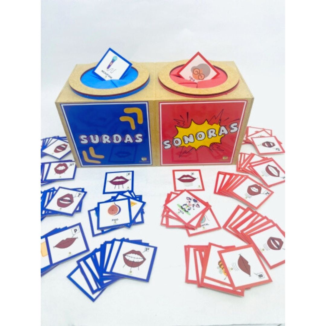 O kit contém 132 cartas com imagens de fonemas em diferentes posições na palavra (inicial, medial e final), o que permite uma abordagem completa e variada. Para usar, a criança retira as cartas e as classifica, separando os sons surdos dos sonoros em uma caixa específica. Isso promove o aprendizado por meio da prática e da interação, tornando, assim, a descoberta dos sons algo divertido e prazeroso.