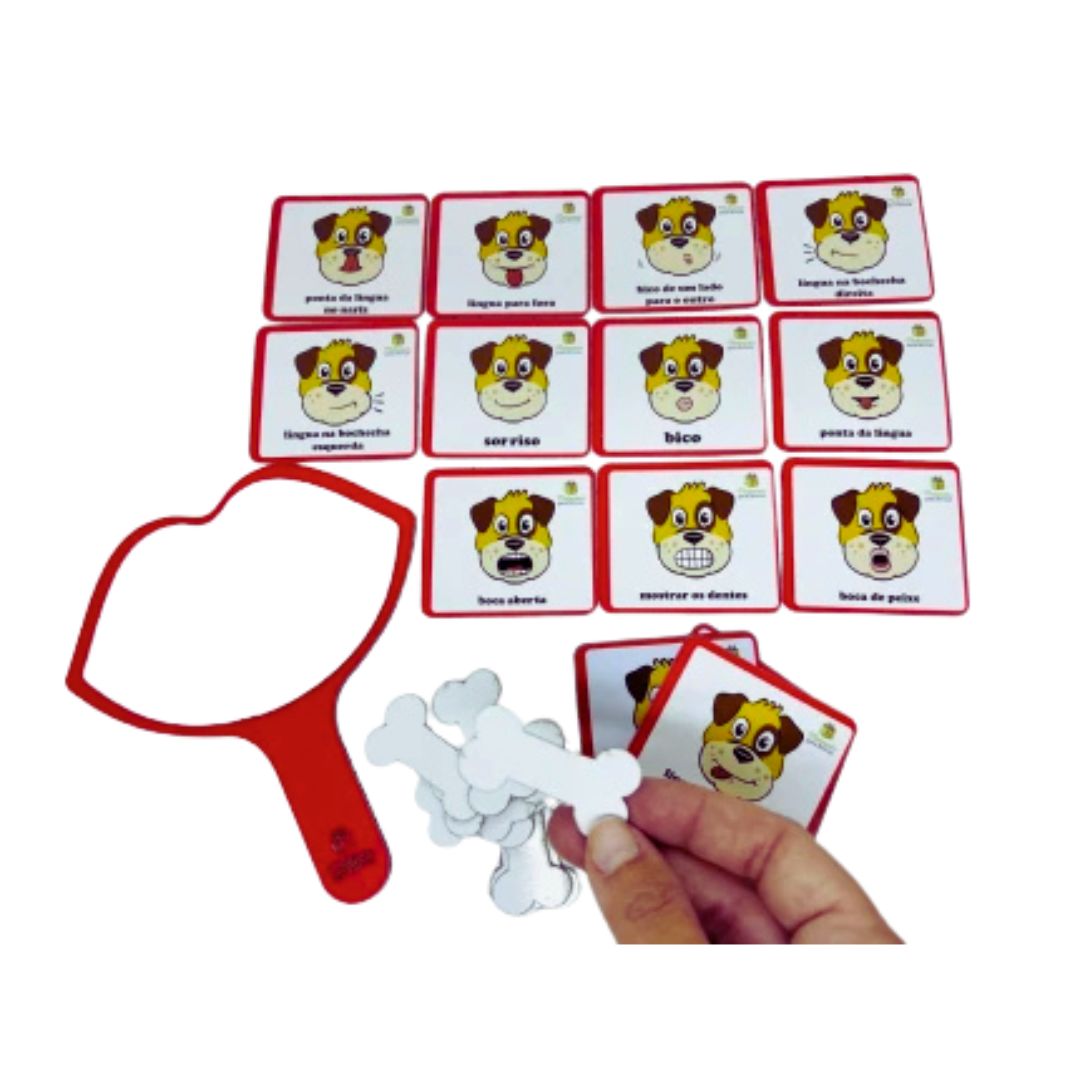 Imite o Cachorrinho fortalece os músculos orofaciais. Inclui figuras magnéticas, ossinhos de recompensa e um espelho. Ideal para o desenvolvimento infantil.
