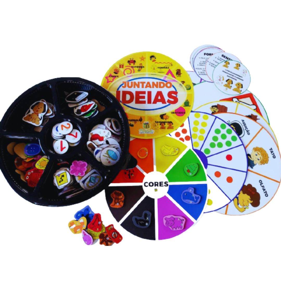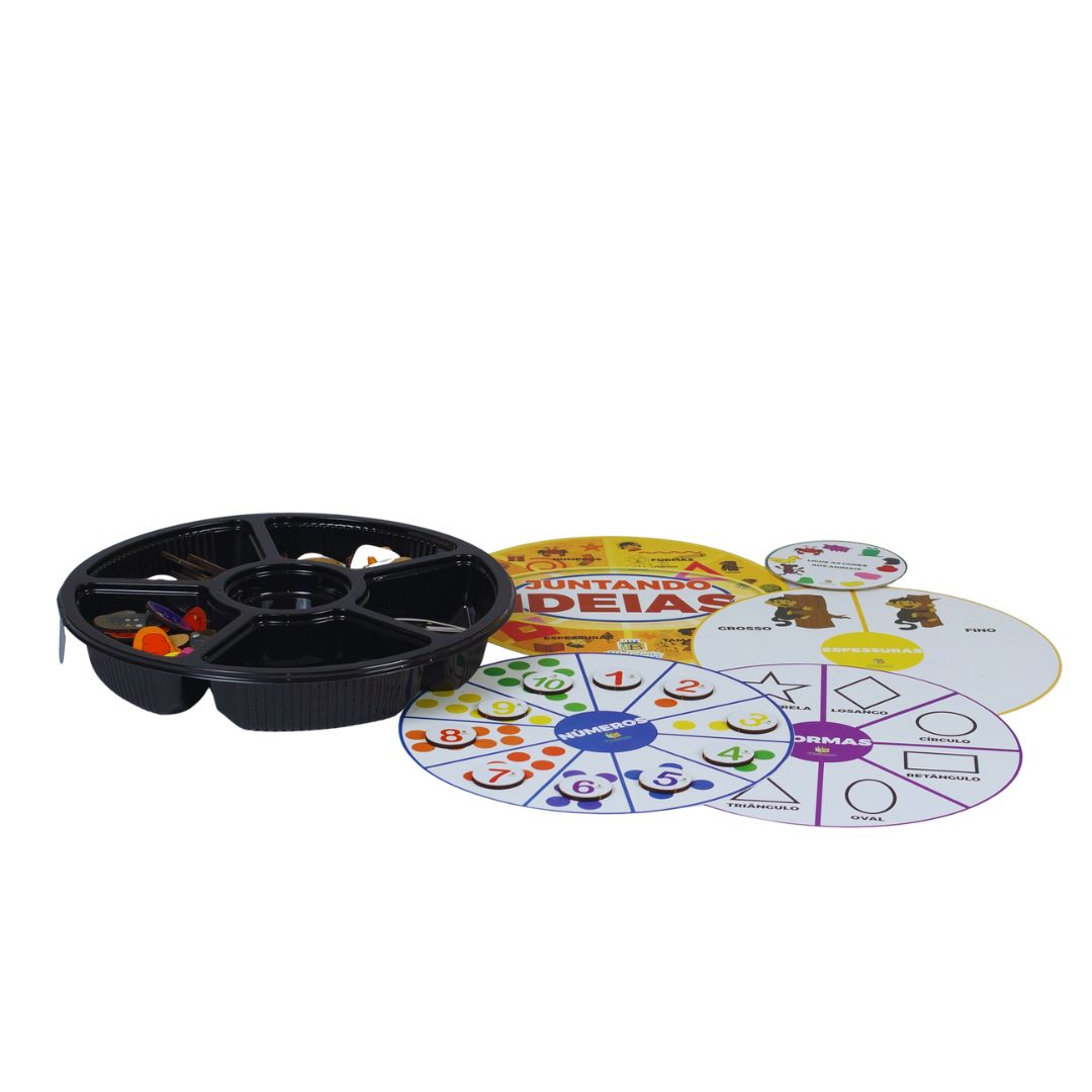 O kit Juntando Ideias trabalha conceitos de cores, formas e números. Contém 121 peças em MDF, 6 cenários e fichas de atividade. Ideal a partir de 3 anos.