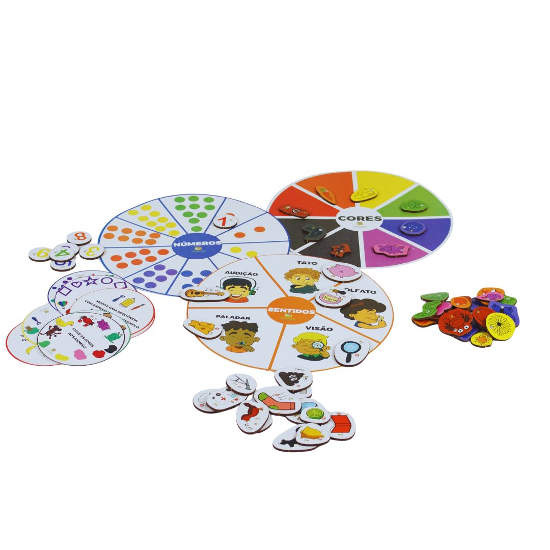 • 121 Peças em MDF: divididas em cores, formas, números, tamanhos, espessuras e sentidos do corpo.
