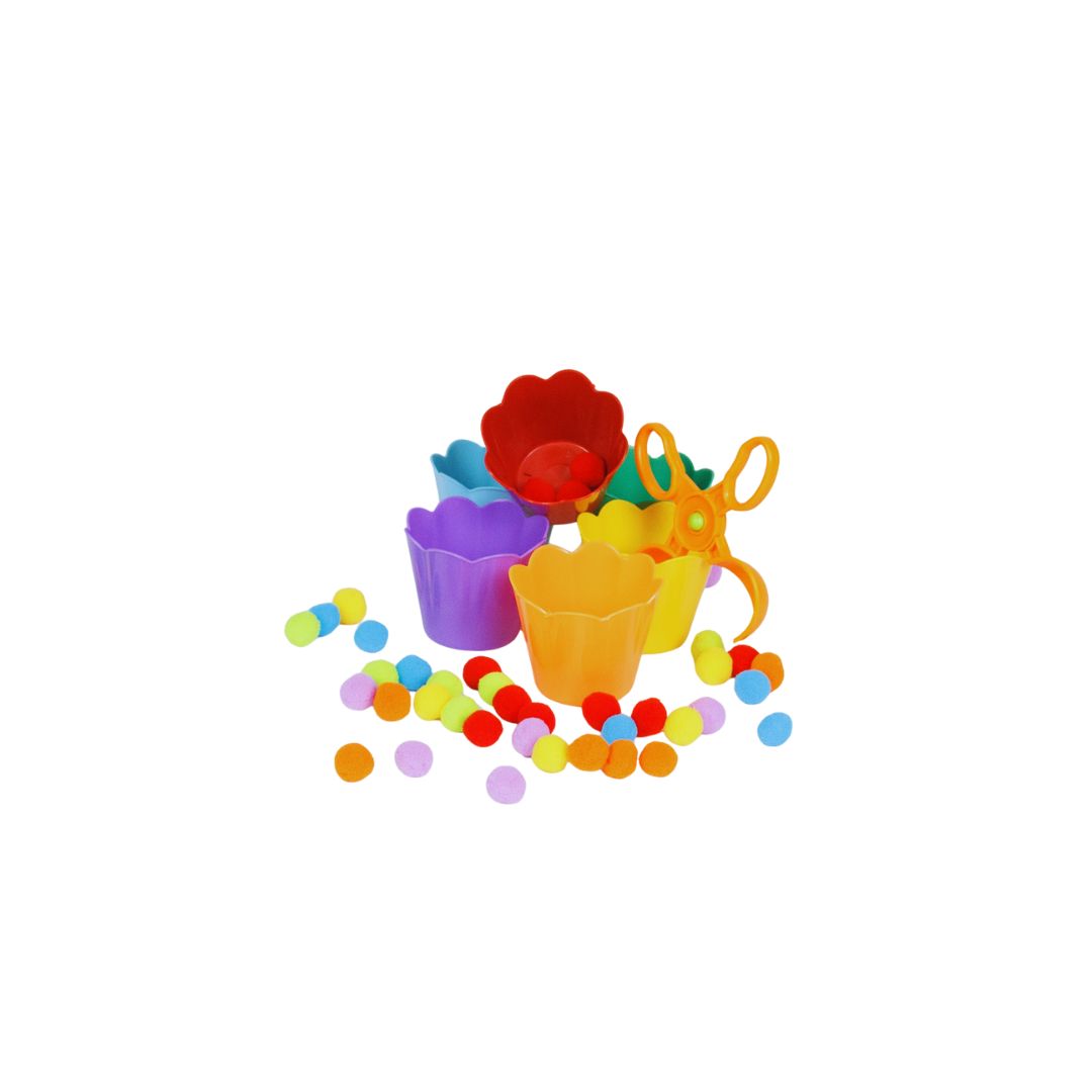 O kit com tesoura, pompons e potes coloridos trabalha a coordenação motora fina e a associação de cores. Ideal para crianças a partir de 3 anos.