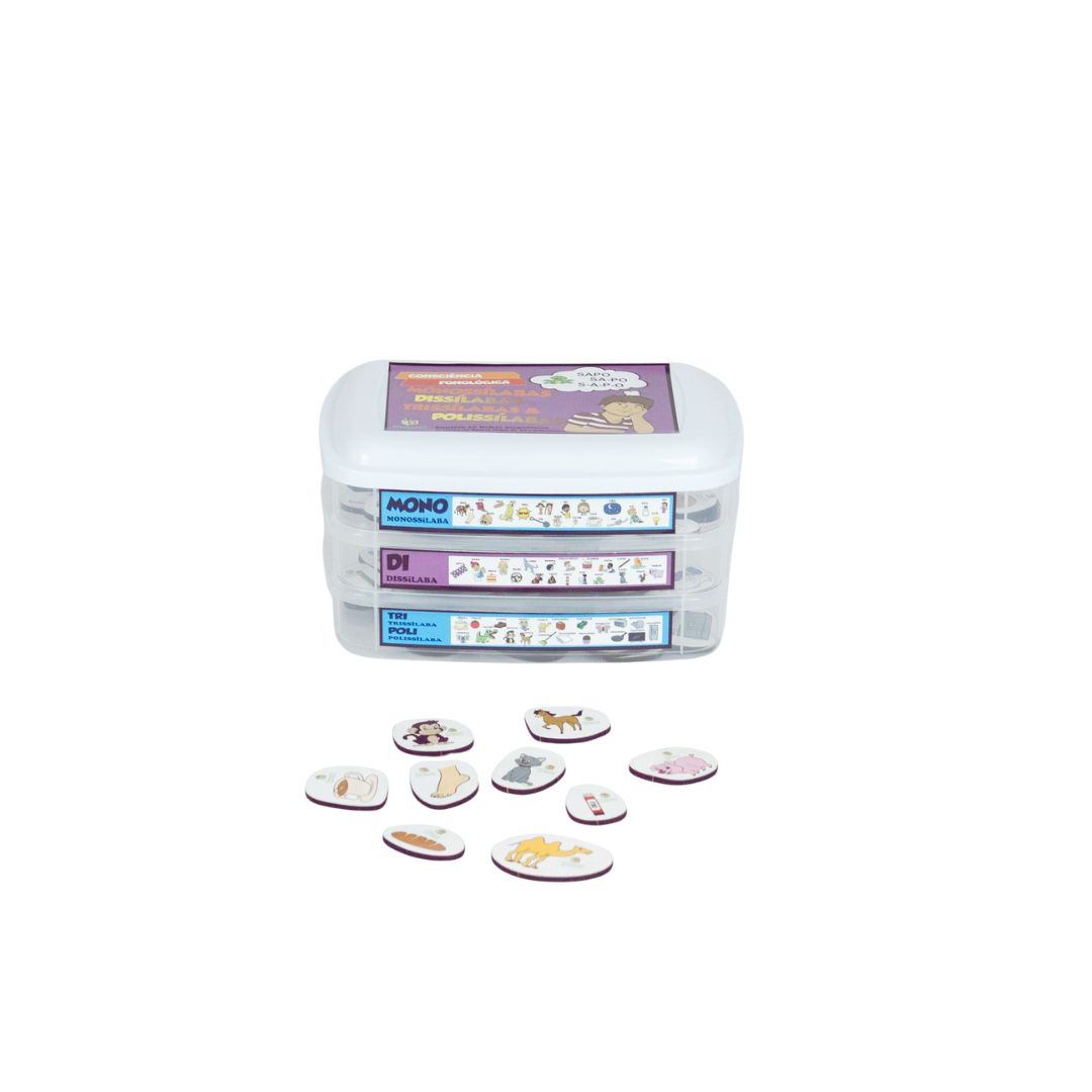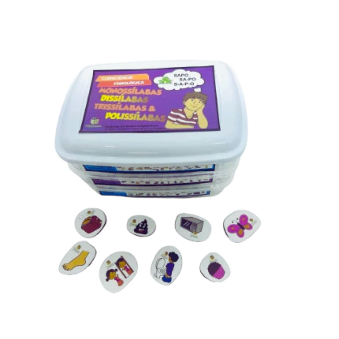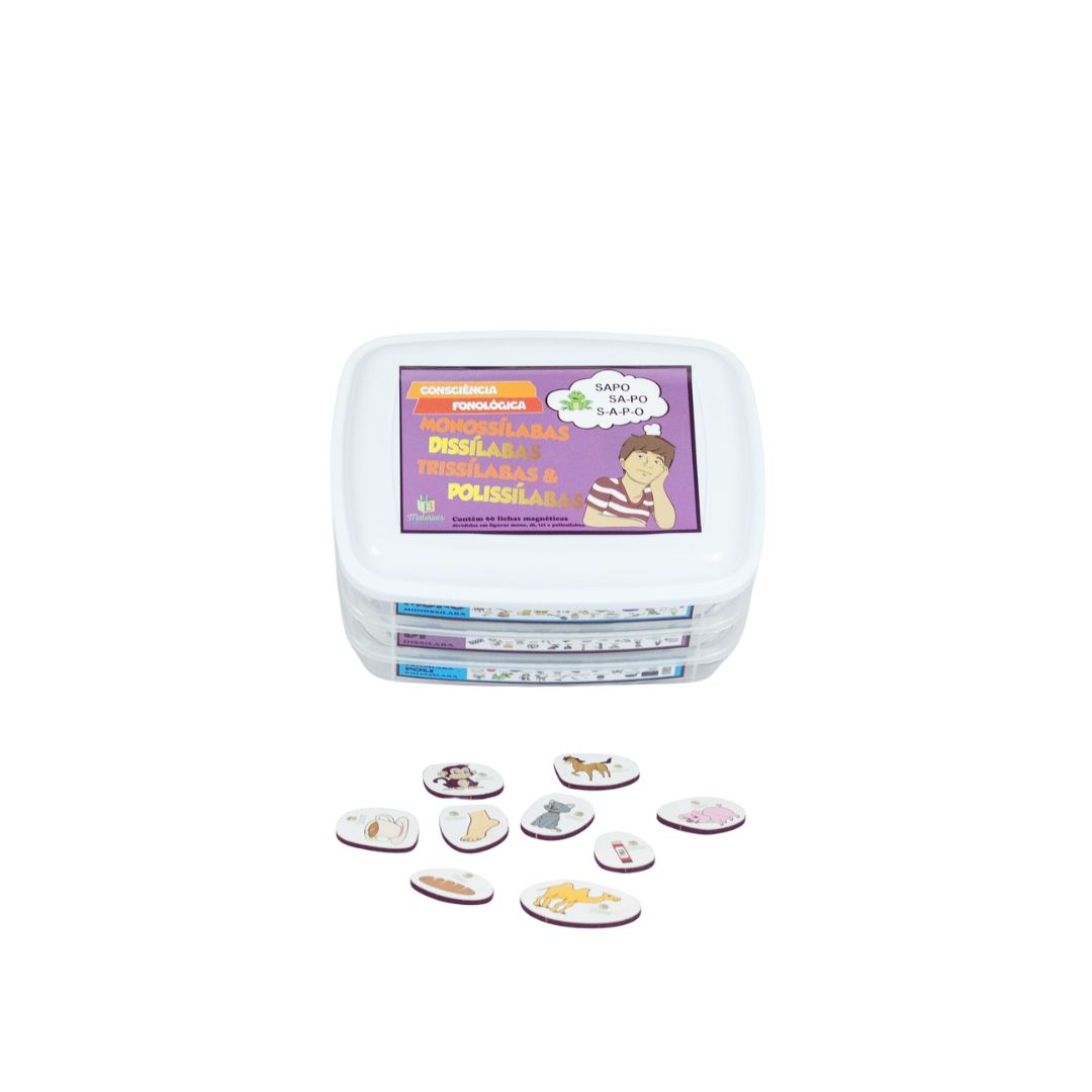 A saber, o kit vem com 60 fichas magnéticas, o recurso é dividido em categorias: monossílabas, dissílabas, trissílabas e polissílabas.