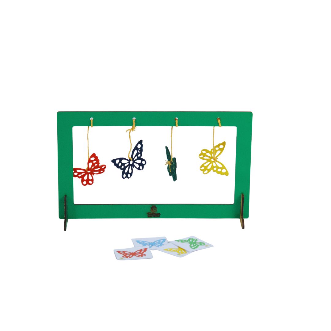 O jogo inclui uma armação em MDF com quatro borboletas feitas de feltro, que flutuam e se movem ao serem sopradas. Por isso, a criança pode começar com o objetivo de mover apenas uma borboleta e, aos poucos, aumentar a intensidade do sopro até conseguir mover todas as quatro.